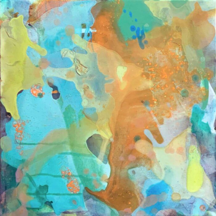 Bei der Entstehung des Hintergrunds gehe ich sehr intuitiv vor. Schicht für Schicht entsteht eine farbenfrohe Komposition, die in die Tiefe geht.