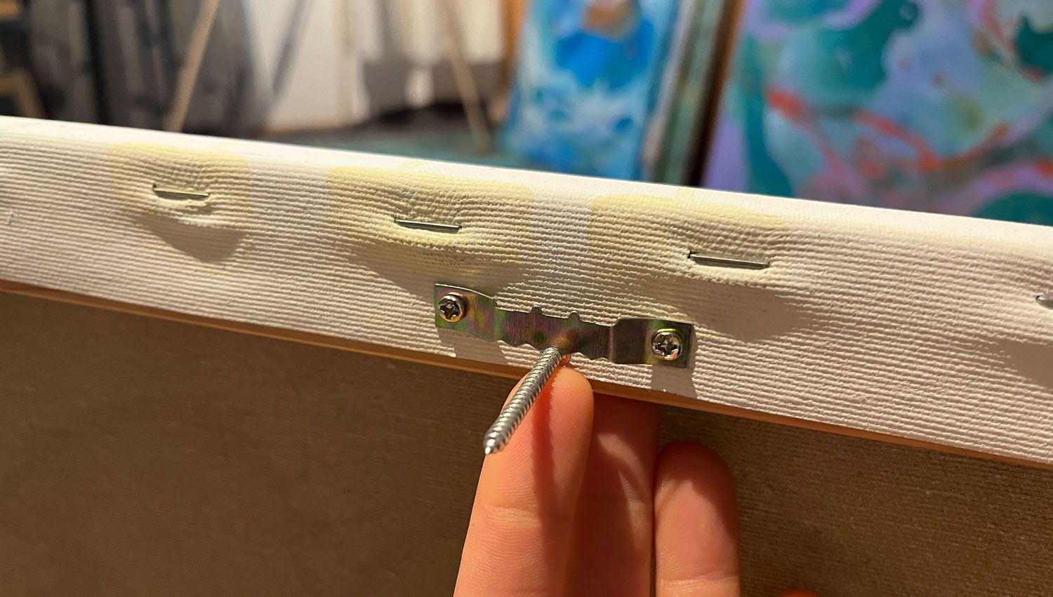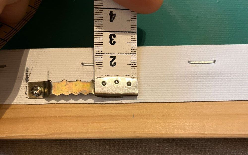 Miss dafür vom Rand der Leinwand bis zur unteren Kante der Bildaufhänger, um die Höhe der Löcher für die Nägel oder Schrauben zu definieren: