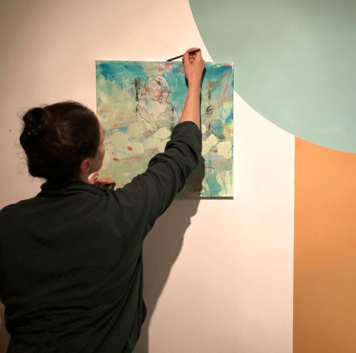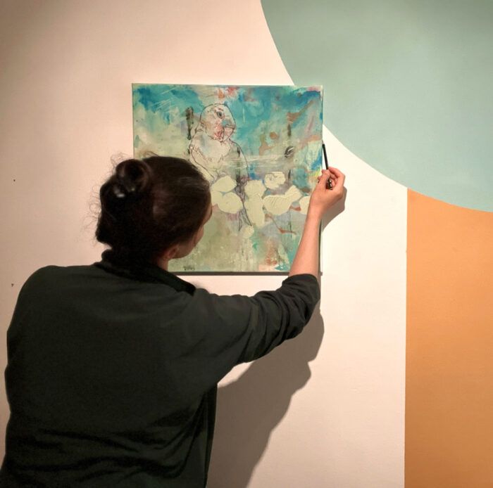 Wenn du alle Hilfsmittel zur Hand hast, geht es darum zu entscheiden, wo das Werk hängen soll. In der Regel werden Kunstwerke in Augenhöhe (145-150 cm über dem Boden) aufgehängt. Dies kann jedoch je nach Höhe der Decke und Größe des Kunstwerks variieren.