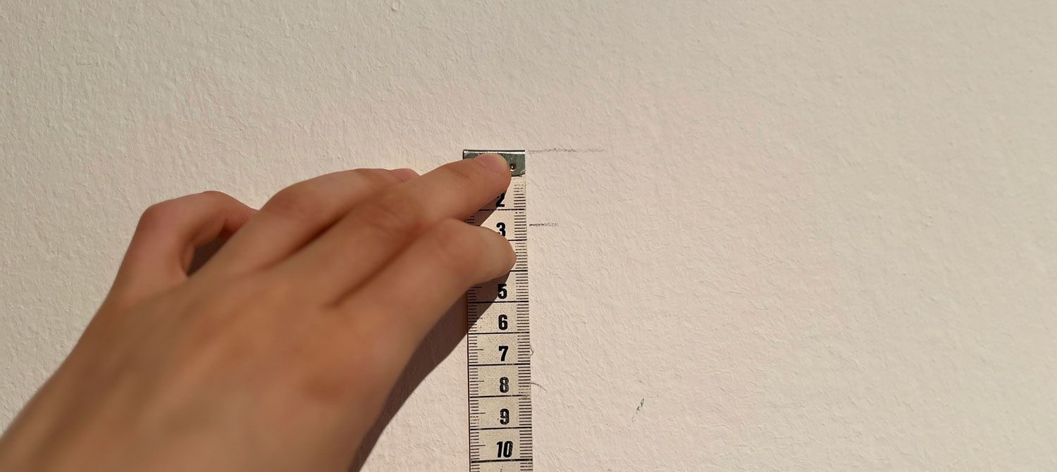 Dafür misst du die Länge von deiner linken bis zur rechten Markierung (seitliche Kennzeichnung des Werks an der Wand) und berechnest davon die Mitte. Von dort aus gehst du jeweils etwa 20 cm nach Außen. Bleibe dabei auf der Höhe, die du vorher definiert hast. Markiere dieses Stelle wieder mit dem Bleistift.